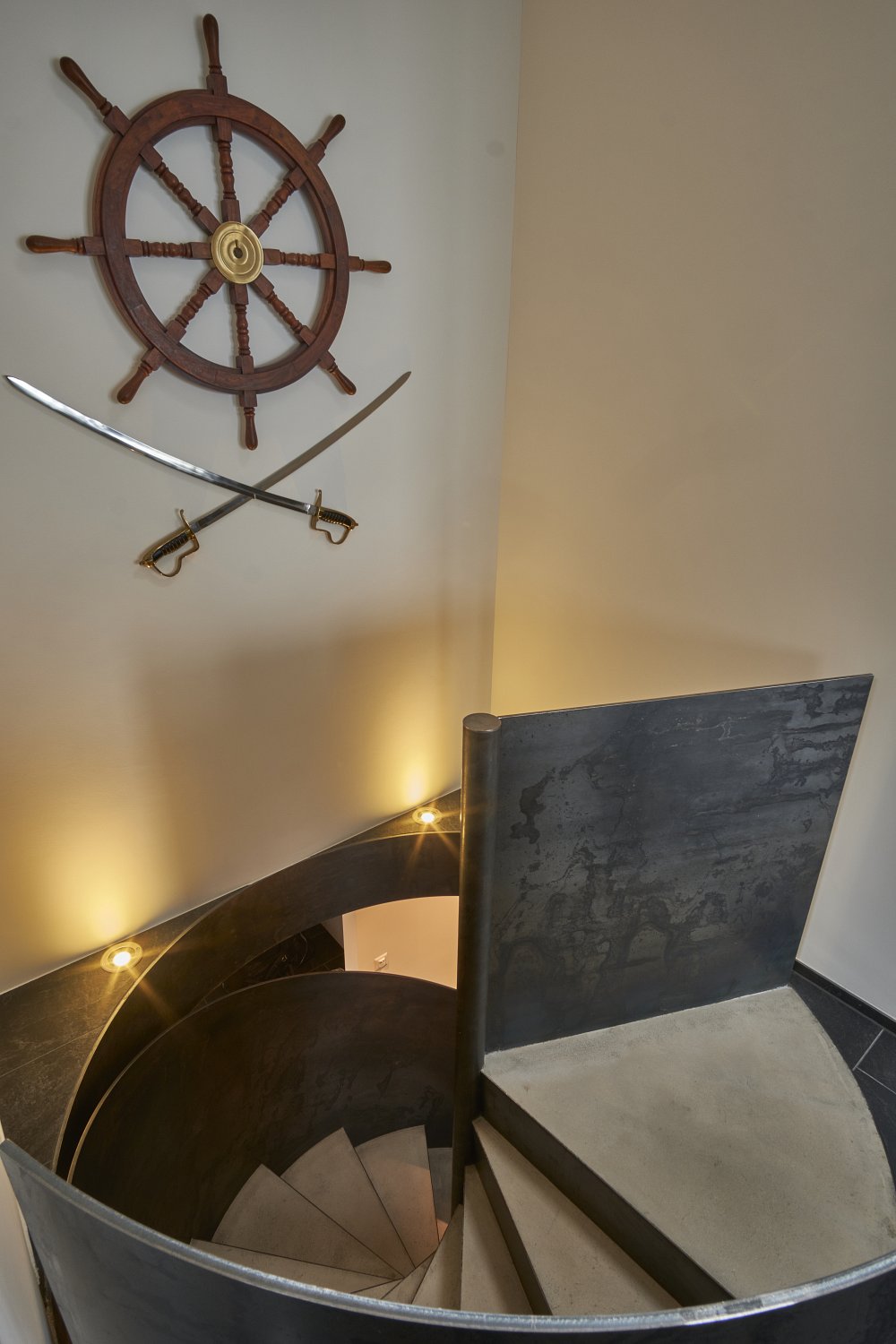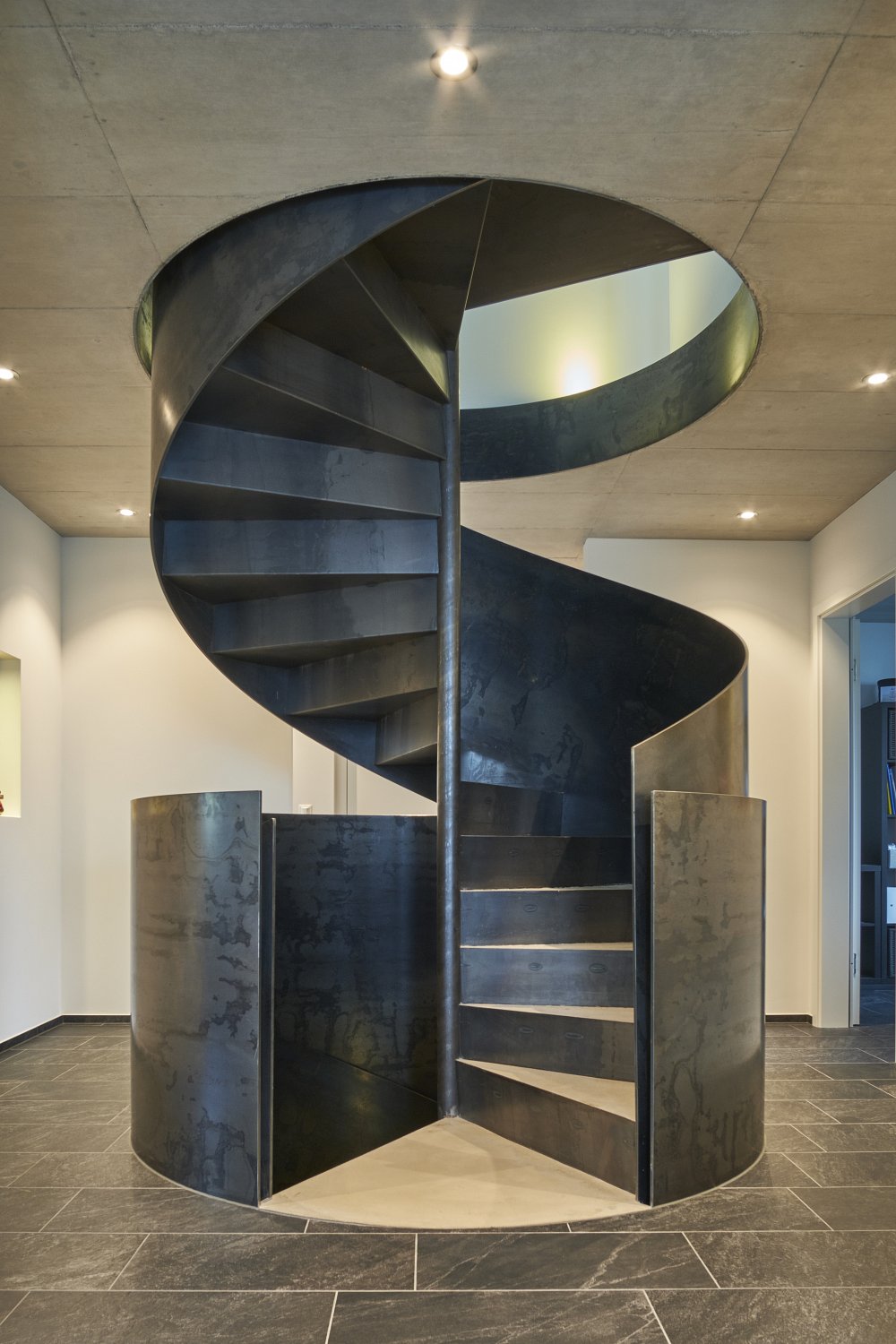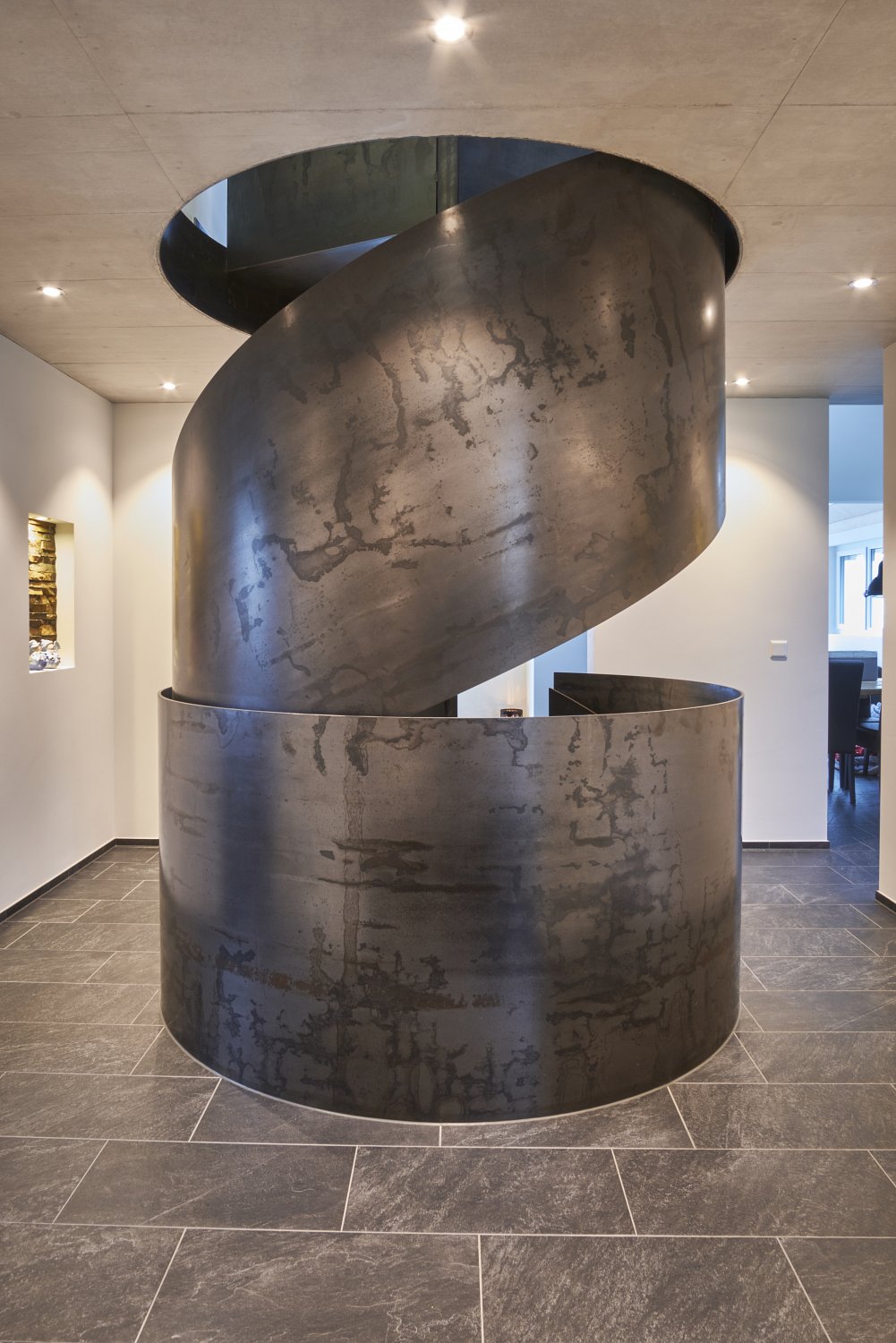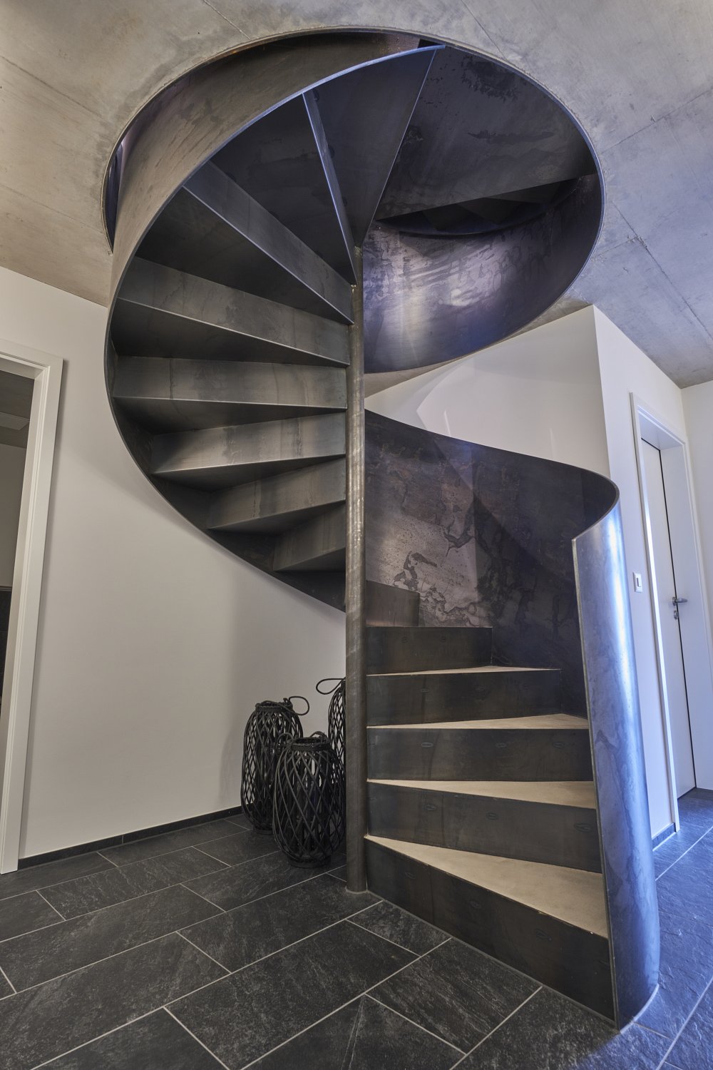 Über zwei Stockwerke erstreckt sich die Stahltreppe welche mit rohen Blechen erstellt wurde.