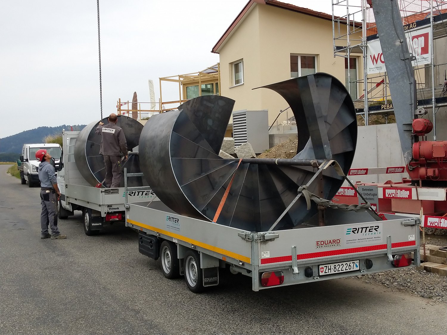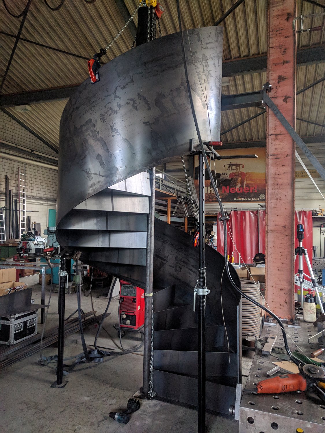 Die Schwierigkeit bestand darin, die Oberfläche der Treppe unter keinen Umständen zu verletzen. Da die Treppe anschliessend nicht Farbbeschichtet wurde, wäre jeder Kratze sichtbar gewesen. Die Schweissnähte wurden soweit wie möglich an Stellen erstellt, welche danach nicht mehr zu sehen waren. Die Tritte wurden gezielt aus den Rohblechen gebrannt damit sie strukturiert in der Treppe zu liegen kommen.